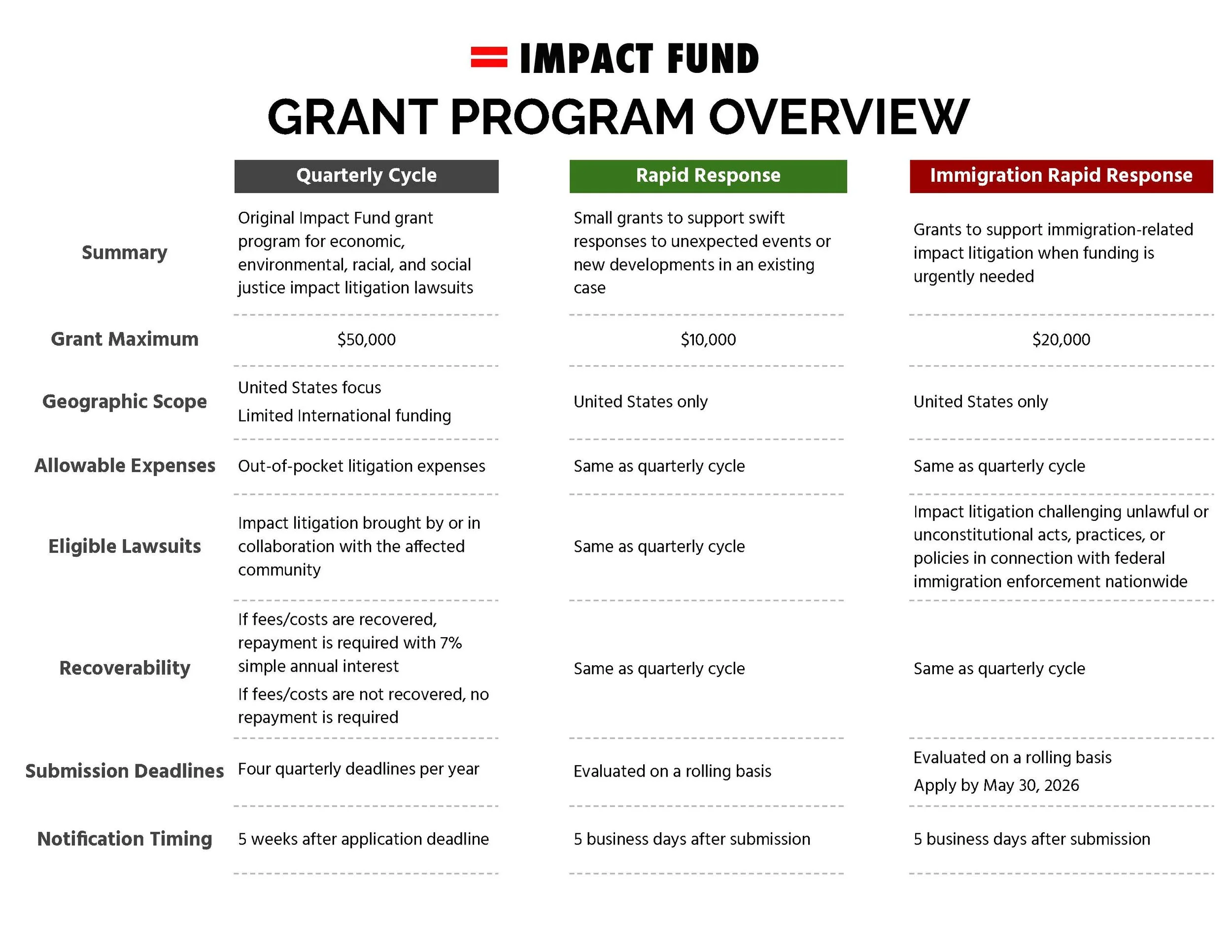 URGENT NEED: The Impact Fund Immigration Rapid Response Fund will provide support to immigration-related impact litigation in instances when funding is urgently needed. Non-urgent requests will remain eligible for our regular quarterly process. Click here to apply for grants through our quarterly process.