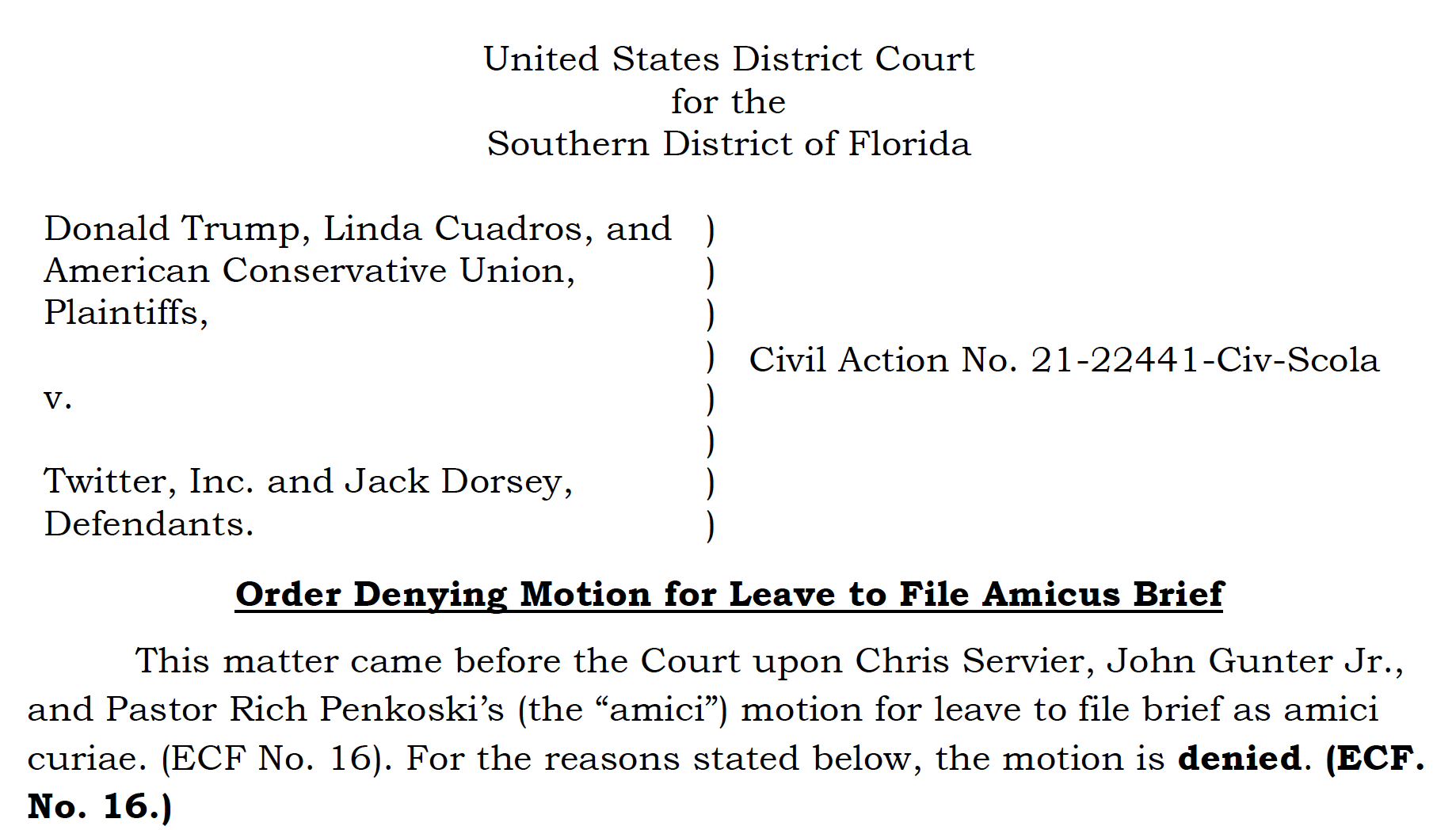 And now, for today’s lesson. Recall that, in early July, Mr. Trump brought class actions against three tech giants for violating his First Amendment rights by banning him from their social media platforms. While the First Amendment only applies to censorship by government actors, Mr. Trump’s lawyers argue that the private companies have become instruments of the government by virtue of the immunity granted to them by Section 230 of the Communications Decency Act, 42 U.S.C. § 230, a law that protects tech companies from lawsuits over their content moderation. While still in the very early days of the case, the Twitter case docket was abuzz with a motion for leave to file an amicus brief. There’s lots to talk about but—spoiler alert—U.S. District Court Judge Robert N. Scola, Jr. swiftly denied the motion from the court’s wannabe friends.