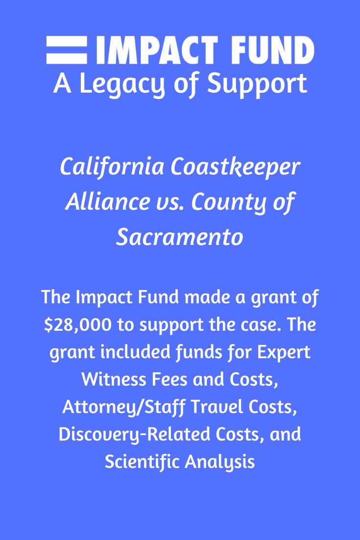 California Coastkeeper Alliance sued Sacramento County due to violations of the Clean Water Act and claims that the County’s system was unable to handle peak wet-weather flows, allowing raw sewage to spill out and threaten fisheries, wildlife, and human health. The frequent spills in the region were unacceptable because of the intensive use of the Sacramento River, the American River, and the Delta for commercial, sport fishing, and water-contact recreation that increases the likelihood of direct human contact with spilled sewage and the toxic chemicals contained within.